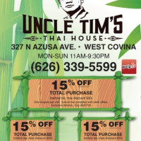 Welcome to Uncle Tim's Thai House, the hidden gem of West Covina, located at 327 N Azusa Ave. This delightful restaurant offers an extensive menu that caters to every palate, featuring a range of soups and vegetarian options that excite the senses. Start your culinary journey with a steaming bowl of Seafood Tom Yum Soup, loaded with shrimp, fish, and a medley of spices for a refreshing kick; or opt for the Tofu Tom Kha, a delightful blend of tofu and galangal in a spicy coconut soup.